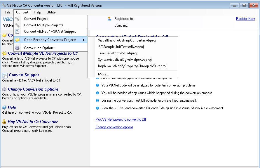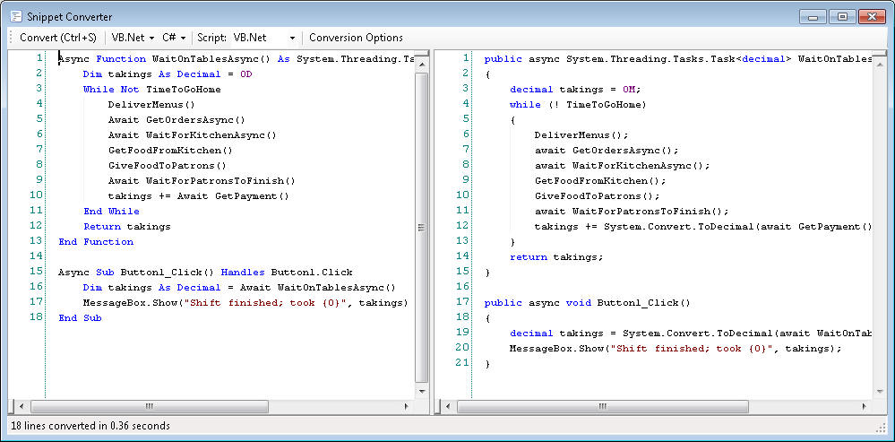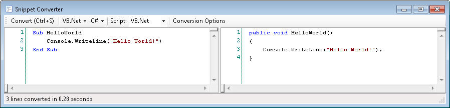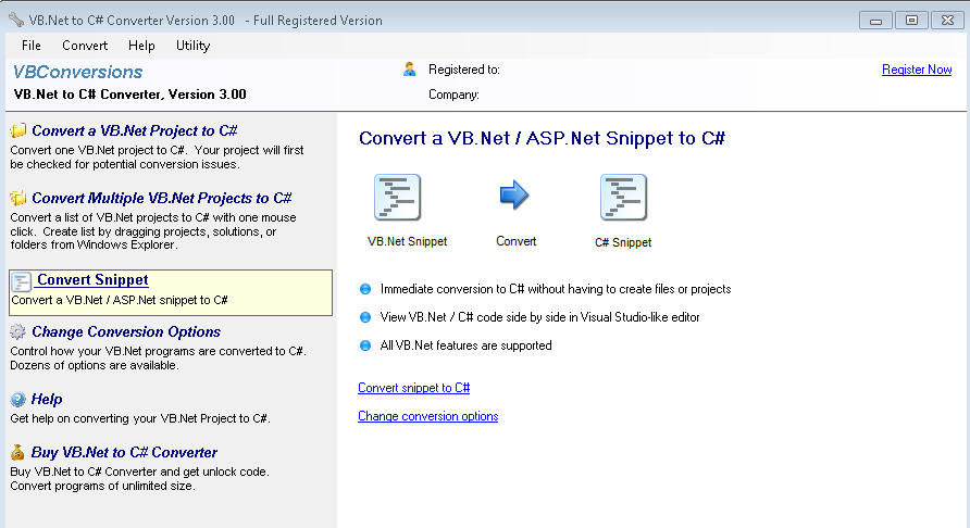 You can now convert VB.Net and ASP.Net snippets without having to convert a full project, using a Visual Studio like editor.