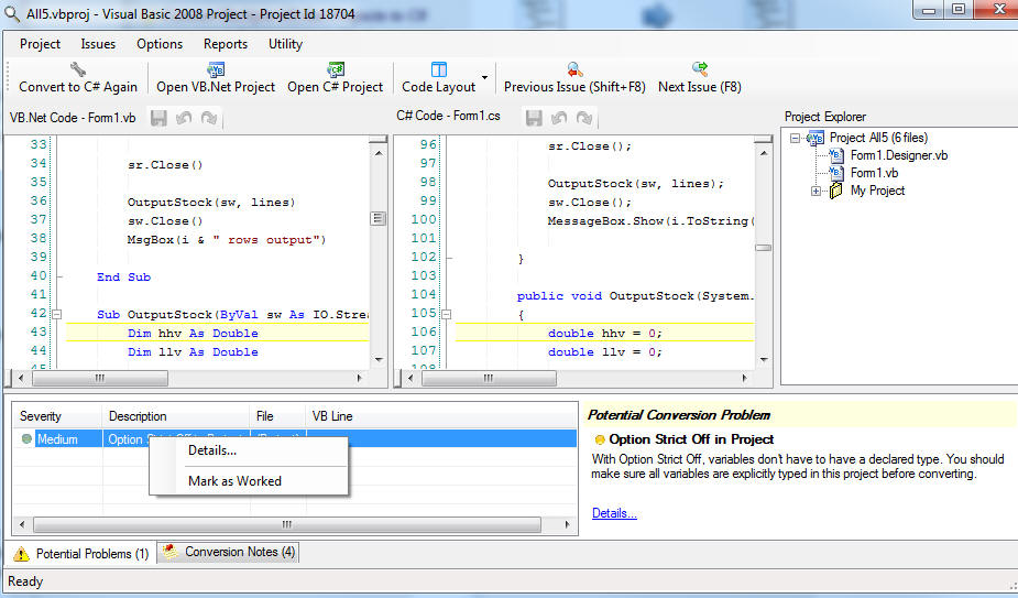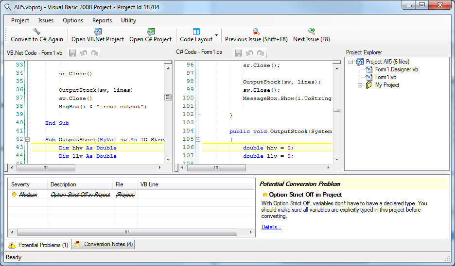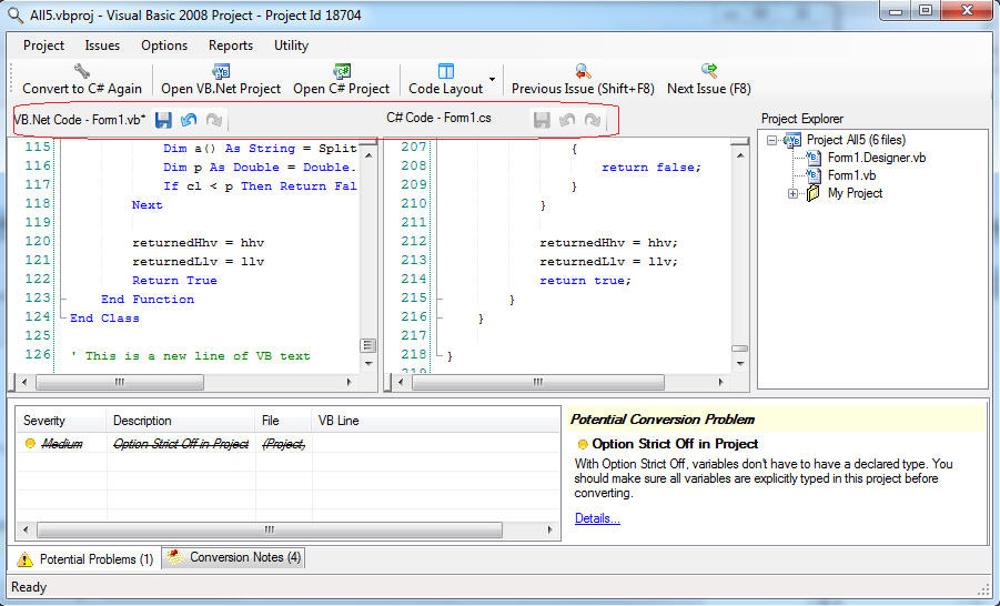 VB.Net and C# code can be directly edited in the converter, without having to find the corresponding lines in Visual Studio.  This is very useful when working a list of issues which have straightforward fixes, and navigating between the converter’s problems/notes/errors and their corresponding positions in the Visual Studio project can be tedious.