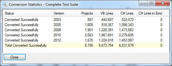 This release was tested on 8,156 projects, containing over 5 million lines of VB.Net code.  All projects converted without C# compiler errors.