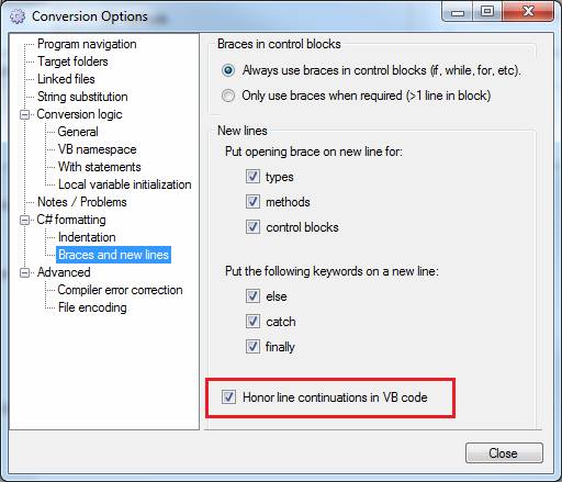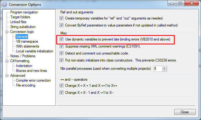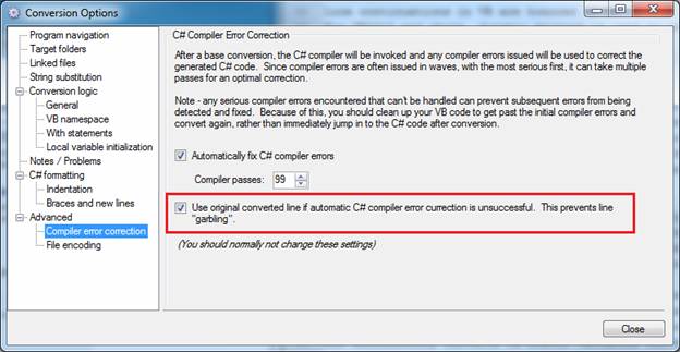 - Prevention of line “garbling”: if automatic C# compiler error correction is unsuccessful, the original converted C# code will be output. This prevents line “garbling”, which can occur after multiple C# compiler correction attempts. This can be controlled in the Options, Compiler error correction section: